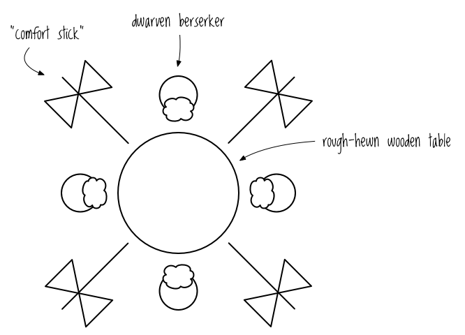 现在,每个人都知道,矮人狂战士结束舒适的咖啡聚会的仪式是拿起他们的 "安慰棒"(双刃战斧),互相抓挠对方的背部。每对矮人之间放一把战斧,如图 9-5 所示。