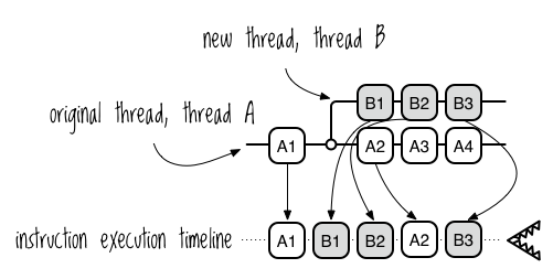 图 9-2 显示了两个线程,A 和 B,以及它们的指令如何执行的时间线。我对线程 B 的指令做了阴影处理,以帮助区分它们与线程 A 的指令。