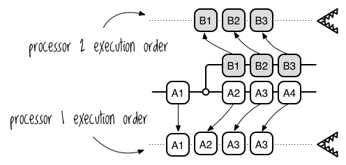 请注意,这只是一种可能的指令执行顺序。例如,处理器也可以按照 A1、A2、A3、B1、A4、B2、B3 的顺序执行指令。这使程序变得 不确定 。你不能事先知道结果是什么,因为你无法知道执行顺序,不同的执行顺序会产生不同的结果。