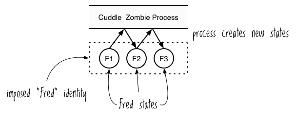 这导致了对身份的不同概念。Clojure 形而上学不是像 OO 形而上学那样把身份理解为变化的对象所固有的,而是把身份理解为我们人类强加给由一个过程随时间产生的一连串不变的值的东西。我们使用名字来指定身份。名字Fred是指一系列单独的状态F1、F2、F3等等的方便方法。从这个角度来看,不存在所谓的可改变的状态。相反,state指的是某个时间点上的身份值。