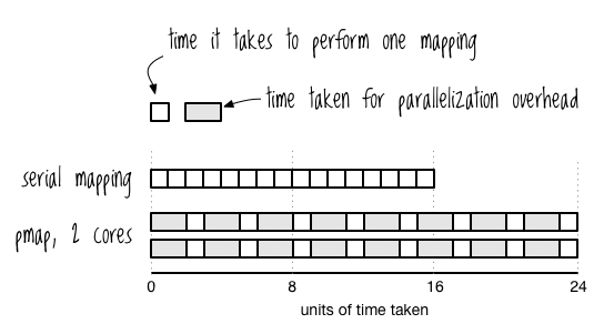 你可能会想,为什么并行版本所花的时间不正好是串行版本的一半。毕竟,两个核心的时间应该只有单核心的一半,不是吗?原因是,在创建和协调线程的过程中,总是会有一些开销。有时,事实上,这种开销所花费的时间会使每个函数应用的时间相形见绌,pmap'实际上会比