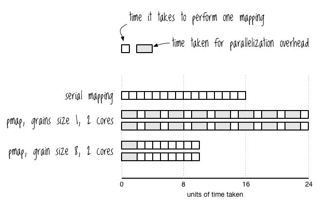 解决这个问题的方法是增加粒度,或者说每个并行化任务所做的工作量。在这种情况下,任务是对集合中的一个元素应用 Map 函数。粒度不是用任何标准单位来衡量的,但你会说pmap