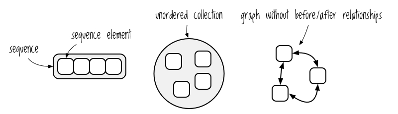 术语 序列 在这里指的是以线性顺序组织的元素集合,而不是无序集合或节点之间没有前后关系的图。图 4-2 显示了你如何将一个序列可视化,与上述其他两个集合形成对比。