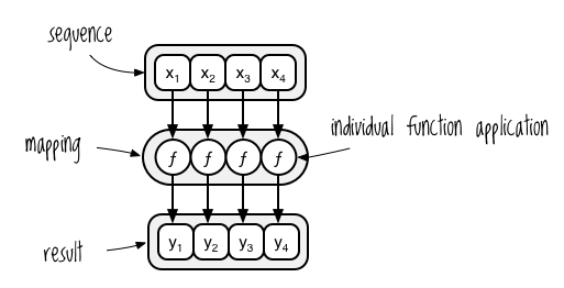 如果你把map操作独立于任何编程语言,甚至是编程,它的基本行为是用一个函数 ƒ 从现有的序列 x 导出一个新的序列 y ,这样 y1 = ƒ(x1), y2 = ƒ(x2), . . . yn = ƒ(xn)。图 4-1 说明了你如何将应用于序列的 Map 可视化。